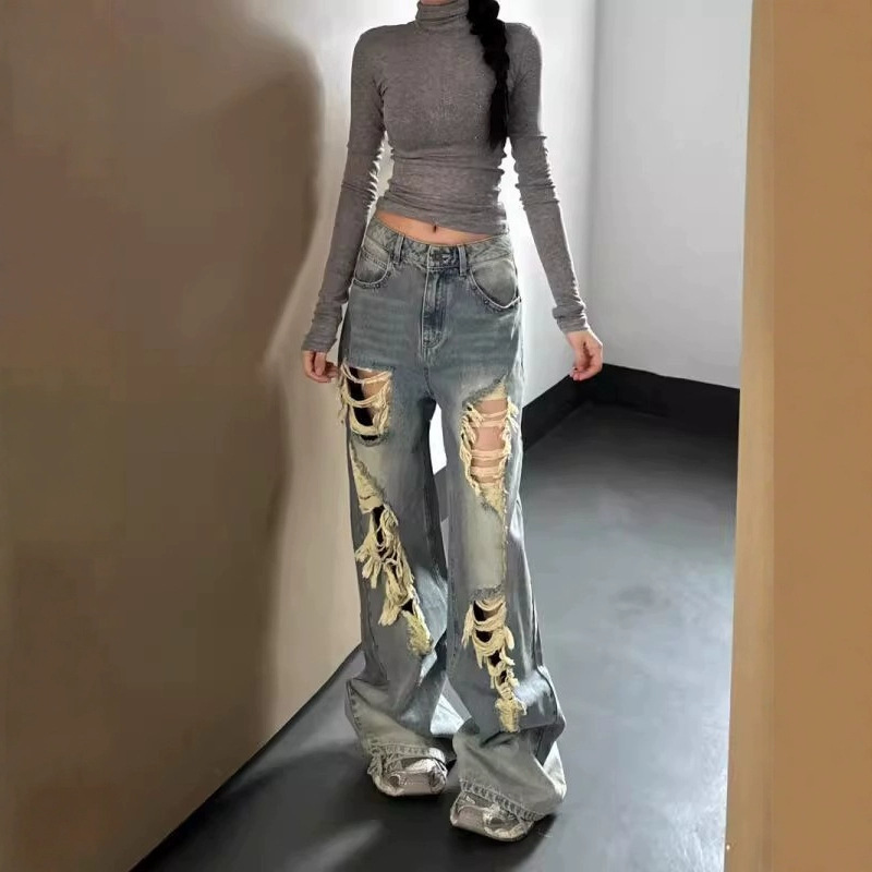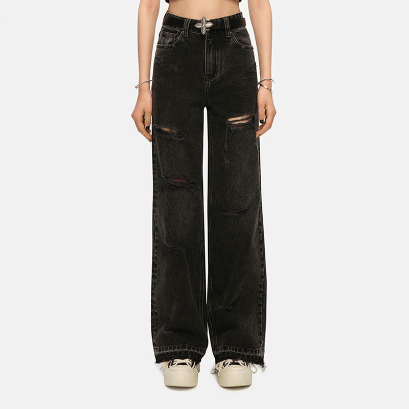 トレンドを押さえたレディースダメージジーンズ。大胆なダメージ加工が施されたワイドシルエットは、カジュアルなスタイルに個性をプラス。ゆったりとした履き心地で、動きやすさも抜群。さまざまなトップスと合わせて、自由自在にコーディネートを楽しめる一品。デイリーユースにもぴったりなアイテムで、洗練されたカジュアルスタイルを実現します。